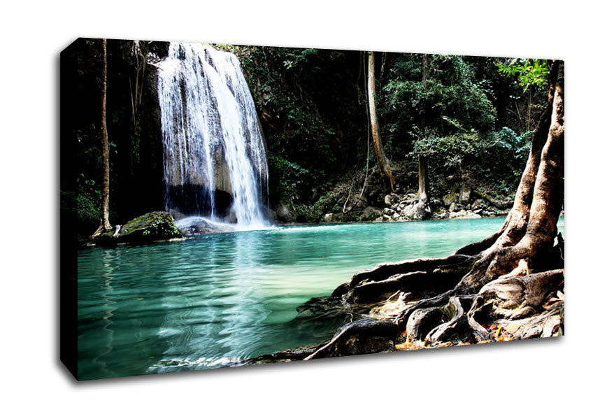 Paradise Waterfall Wide Canvas Print handmade in the UK. Stretched over a 2 inch thick wooden box frame, ready to hang on your wall.