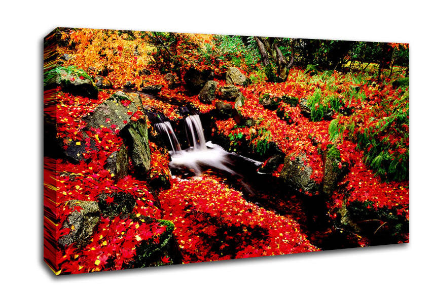 Red Winter Waterfall Wide Canvas Print handmade in the UK. Stretched over a 2 inch thick wooden box frame, ready to hang on your wall.