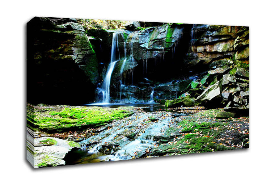 Rocky Waterfall Spill Wide Canvas Print handmade in the UK. Stretched over a 2 inch thick wooden box frame, ready to hang on your wall.