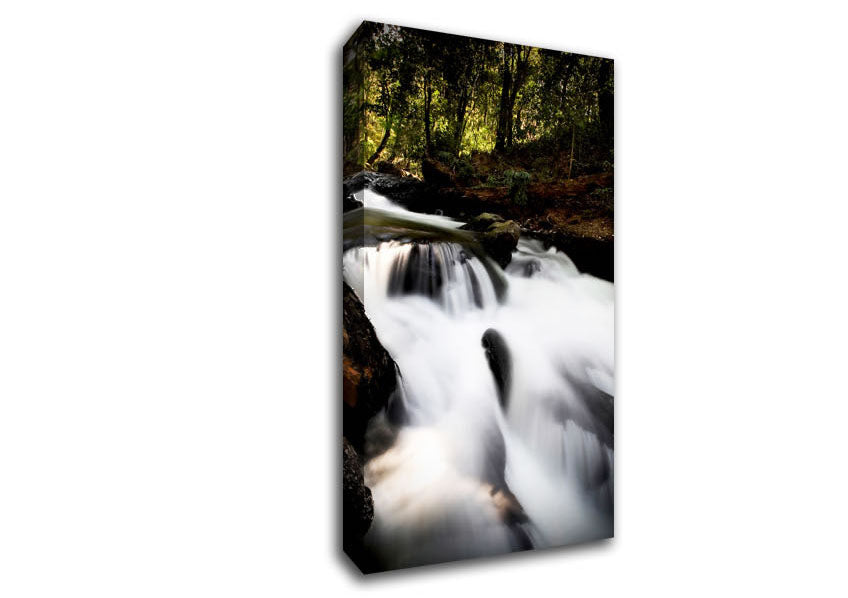 The Woodland Waterfall Wide Canvas Print handmade in the UK. Stretched over a 2 inch thick wooden box frame, ready to hang on your wall.