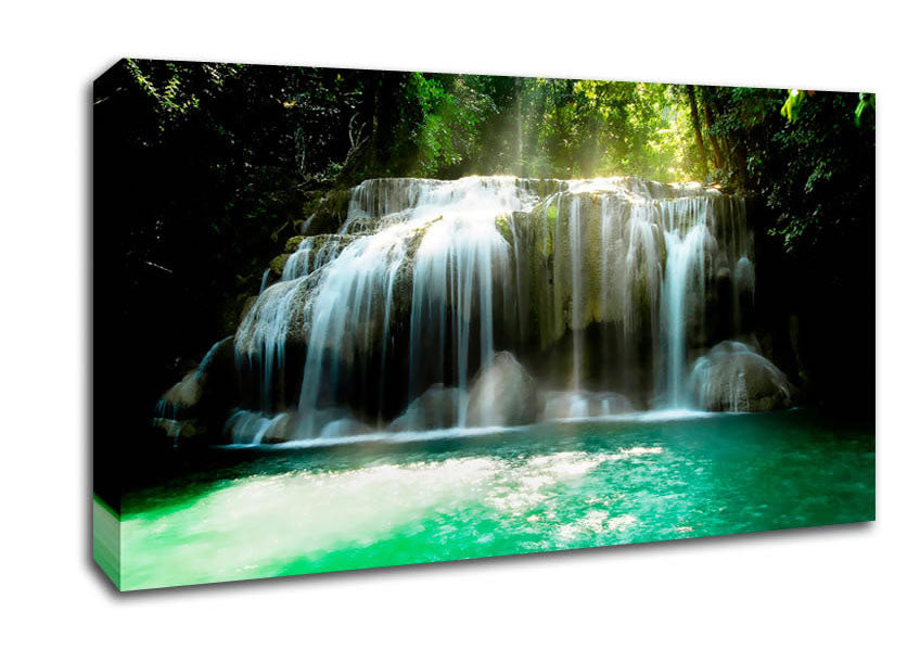 Waterfall Paradise Clear Waters Wide Canvas Print handmade in the UK. Stretched over a 2 inch thick wooden box frame, ready to hang on your wall.