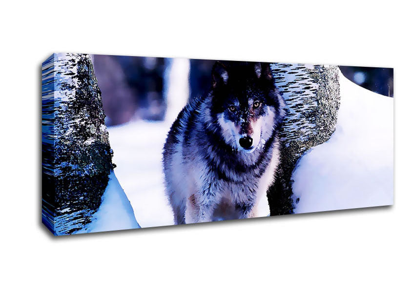 Wolf In The Snow Panoramic Canvas Print handmade in the UK. Stretched over a 2 inch thick wooden box frame, ready to hang on your wall.