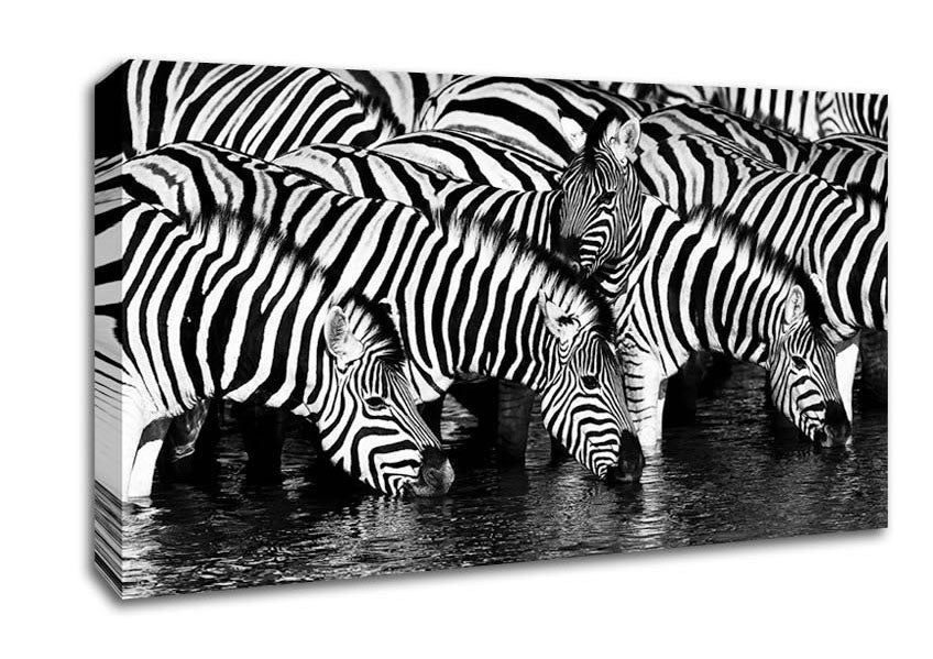 Zebra Drinking Wide Canvas Print handmade in the UK. Stretched over a 2 inch thick wooden box frame, ready to hang on your wall.