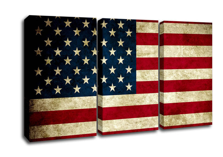 Grunge Flag Of America 3 Panel Canvas Print handmade in the UK. Stretched over a 2 inch thick wooden box frame, ready to hang on your wall.