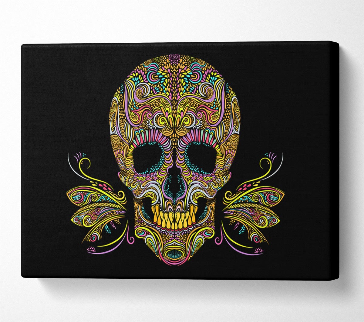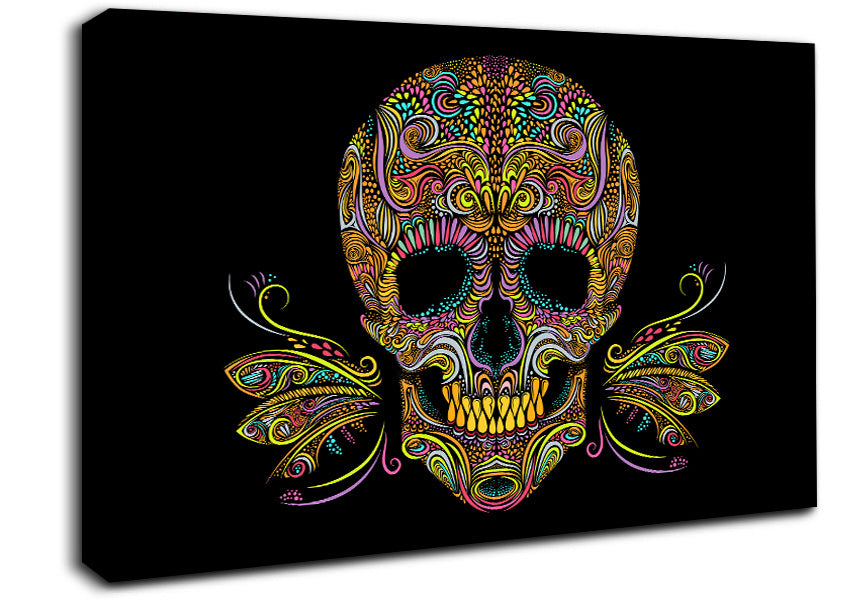 Colourful Mexican Skull Canvas Print handmade in the UK. Stretched over a 2 inch thick wooden box frame, ready to hang on your wall.