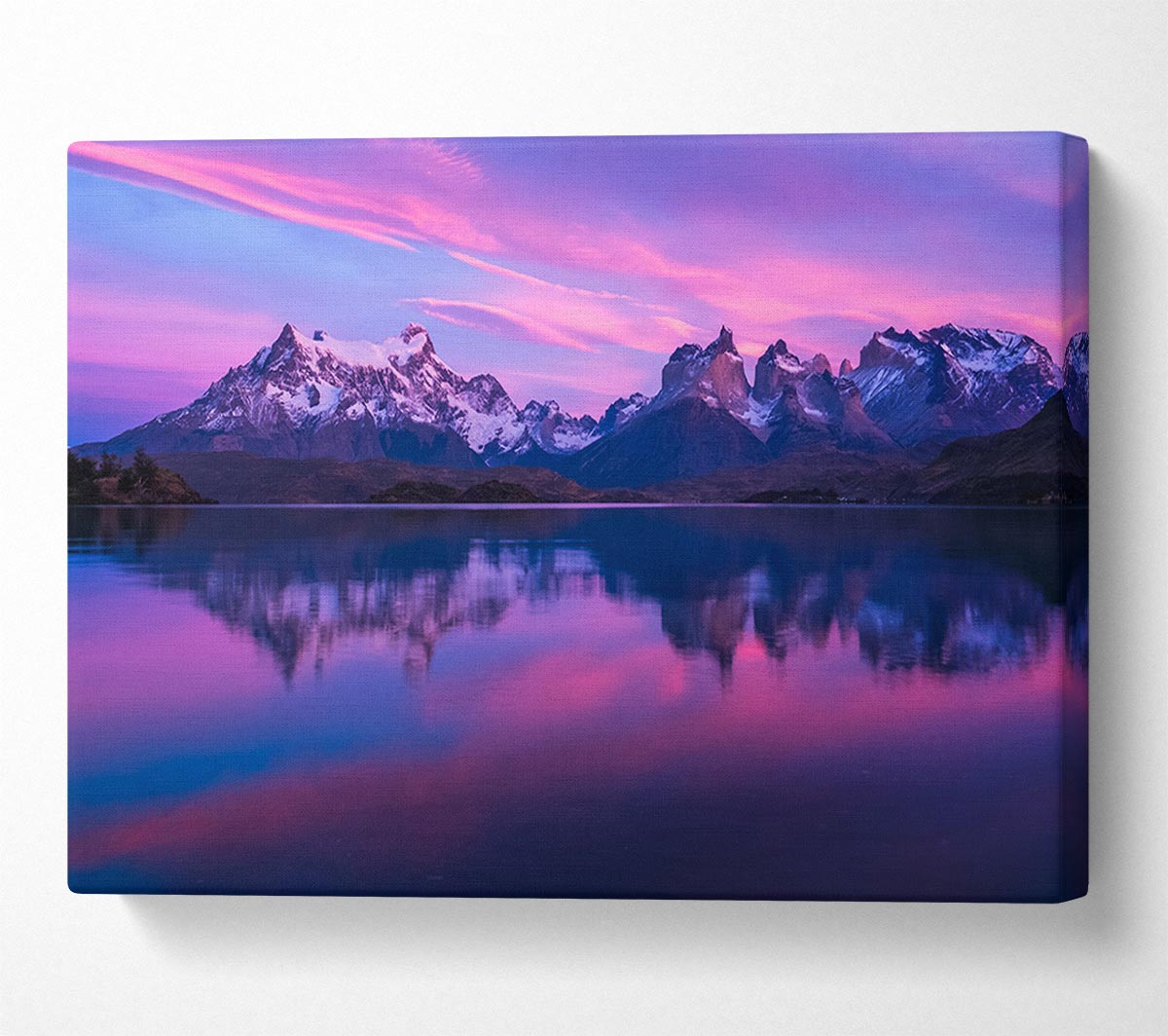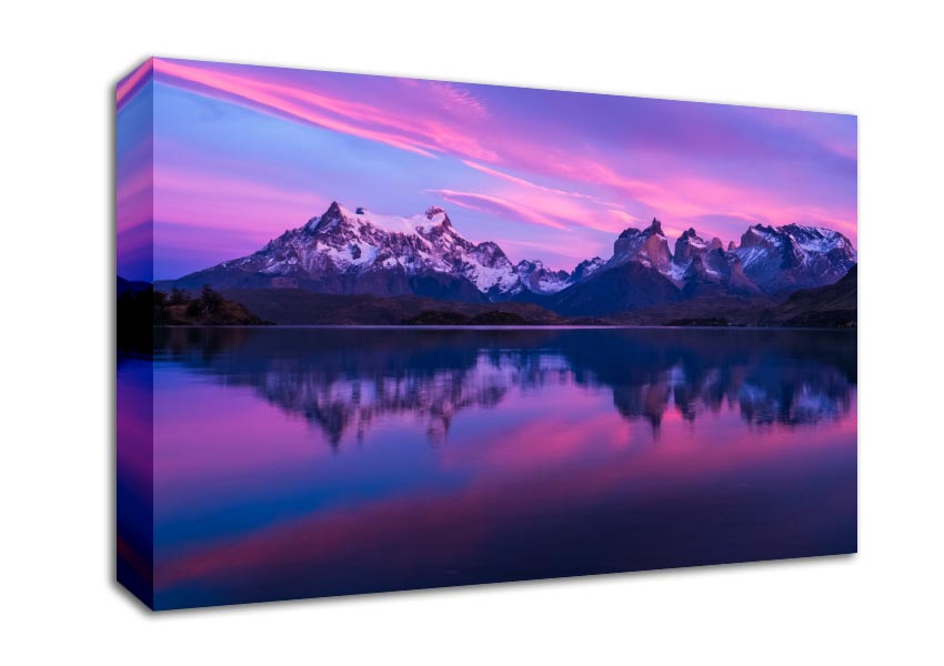 Purple and blue mountains above lake Canvas Print handmade in the UK. Stretched over a 2 inch thick wooden box frame, ready to hang on your wall.