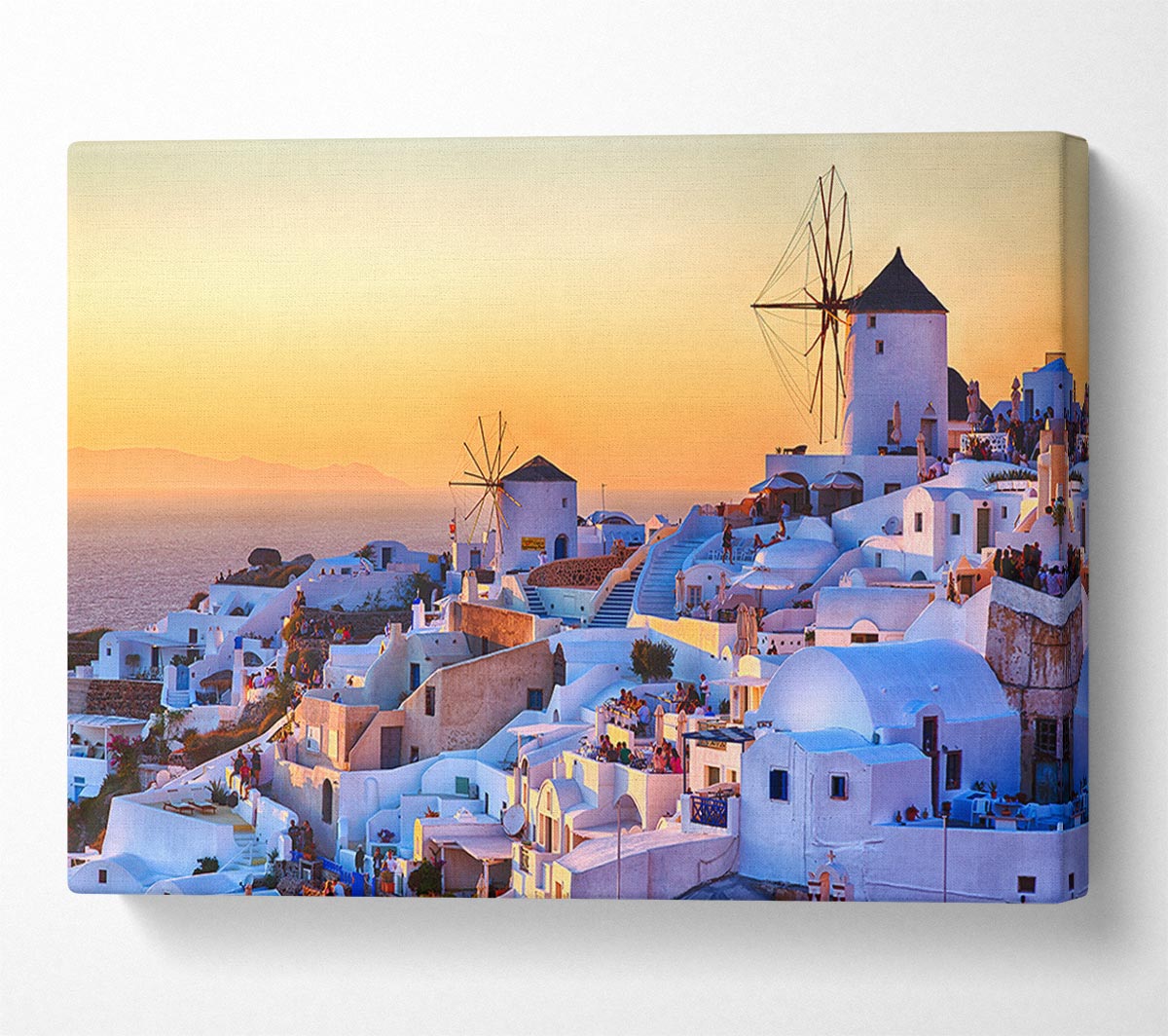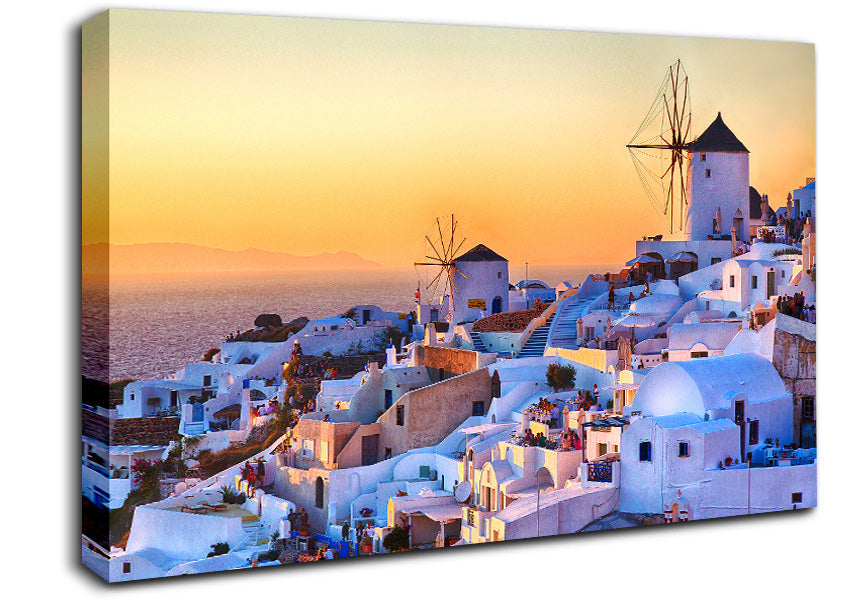 Sunset In Santorini Canvas Print handmade in the UK. Stretched over a 2 inch thick wooden box frame, ready to hang on your wall.