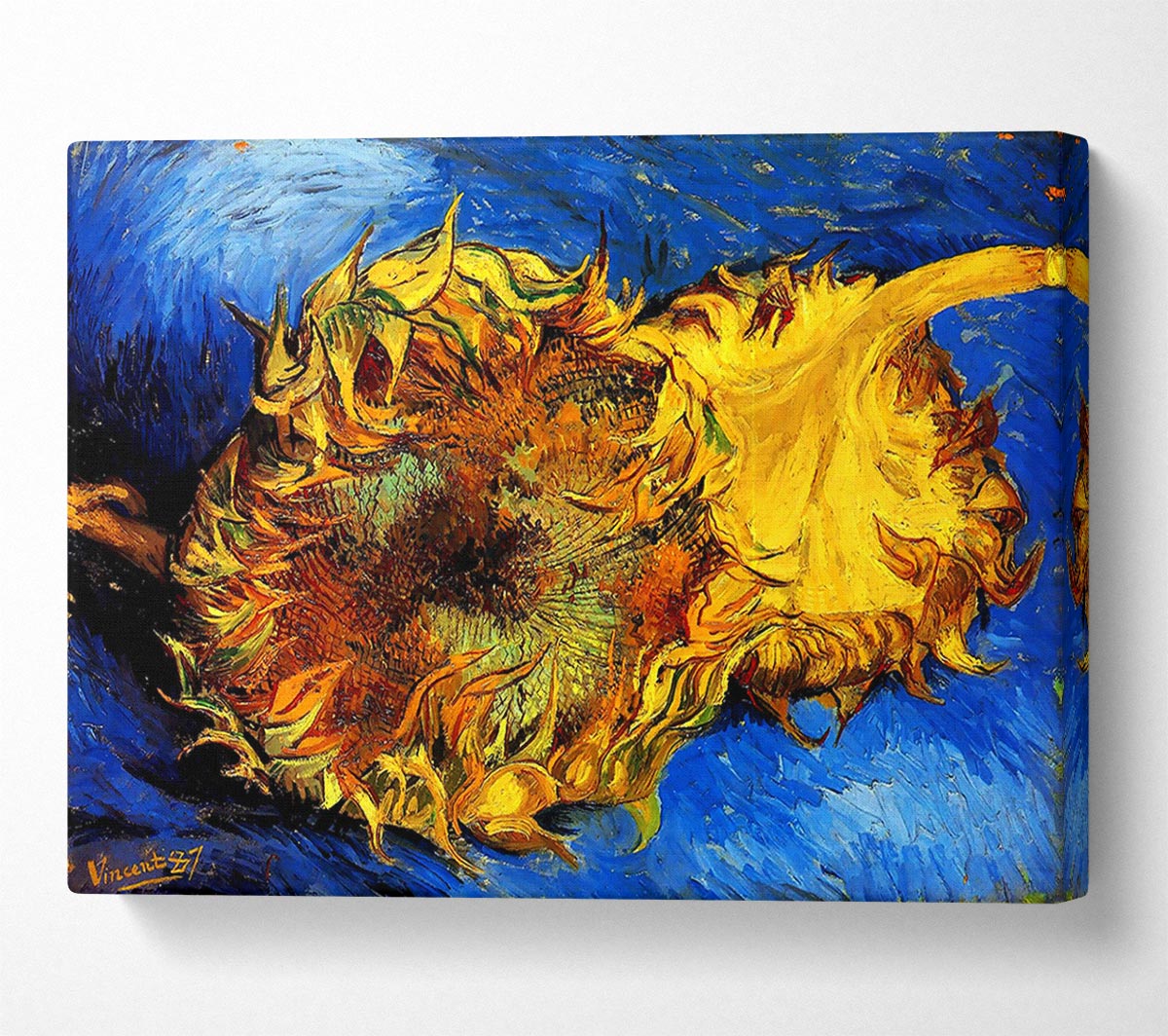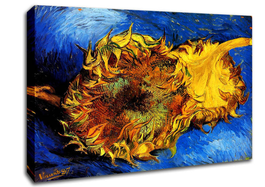 Van Gogh Two Cut Sunflowers 3 Canvas Print handmade in the UK. Stretched over a 2 inch thick wooden box frame, ready to hang on your wall.