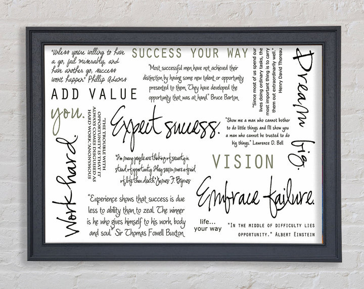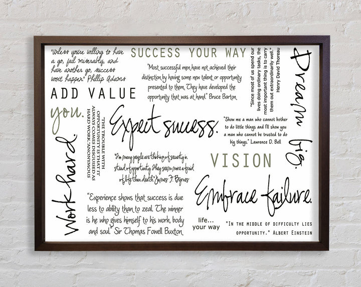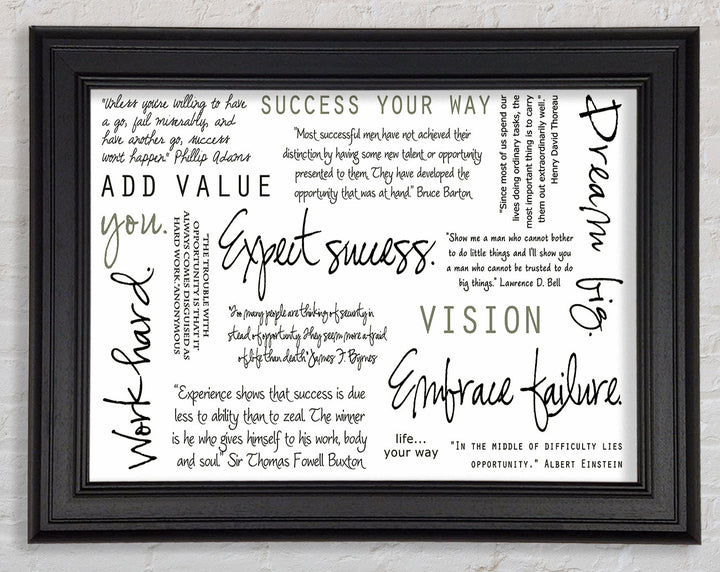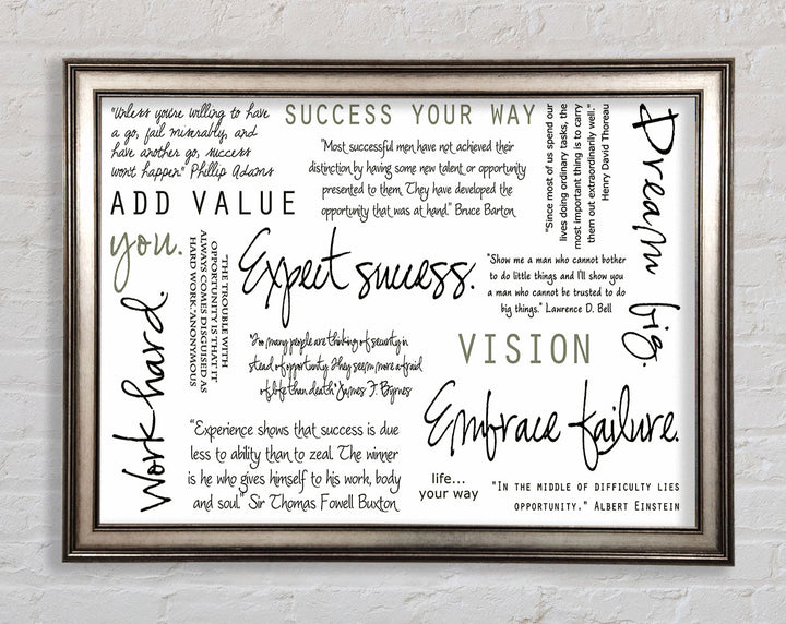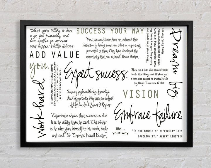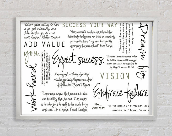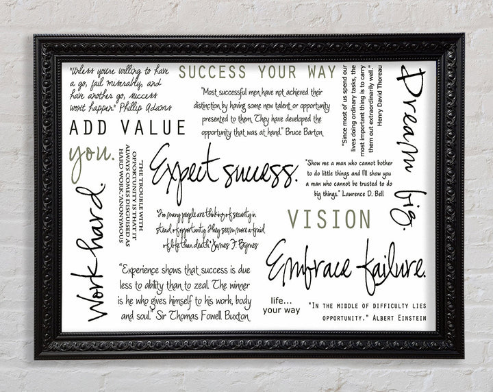 Introducing the "Work Hard Dream Big Expect Success" Framed Print, the perfect addition to any home or office space. This inspiring piece of framed art is available in six sizes, ranging from small to oversized, ensuring a perfect fit for any wall. Choose from a variety of colors to match your decor and make a bold statement. Each print is meticulously handmade in the United Kingdom, guaranteeing high-quality craftsmanship. Ready to hang, this art piece requires no additional effort, allowing you to enjoy its motivational message immediately. Elevate your environment with this beautiful and encouraging framed print, and let it remind you to always strive for success.