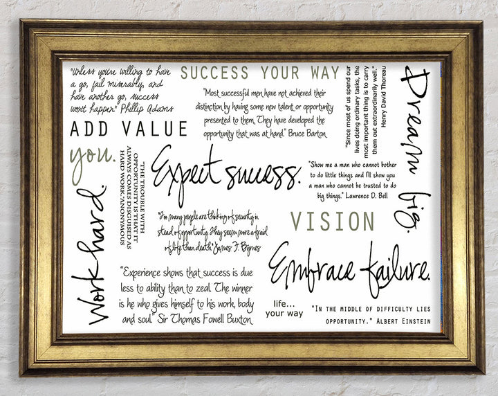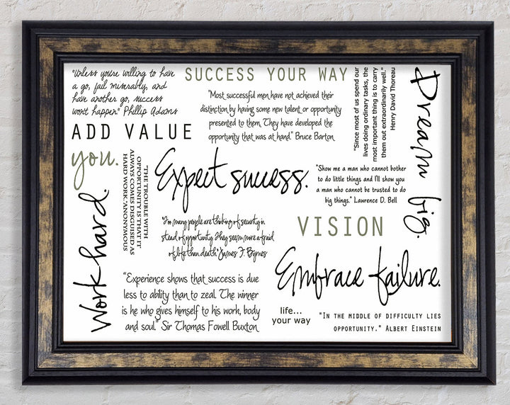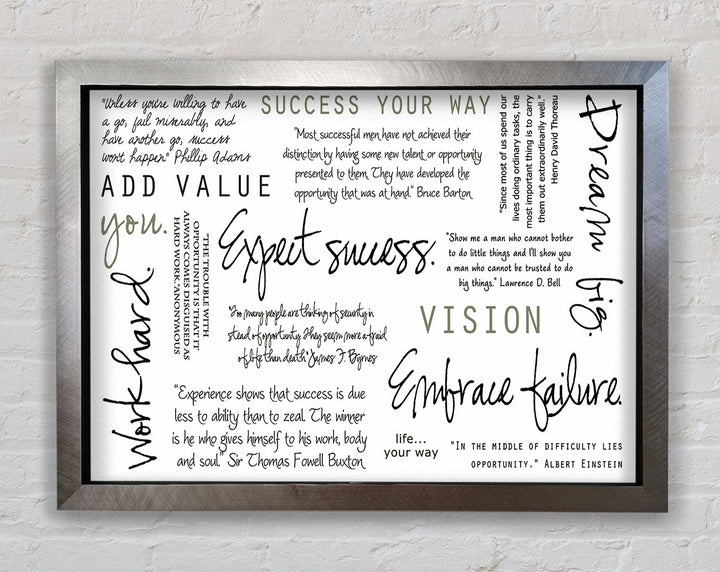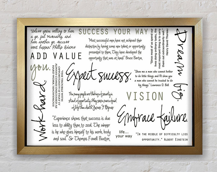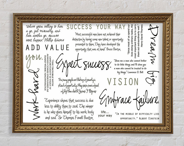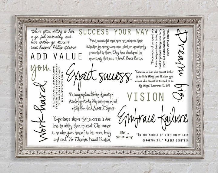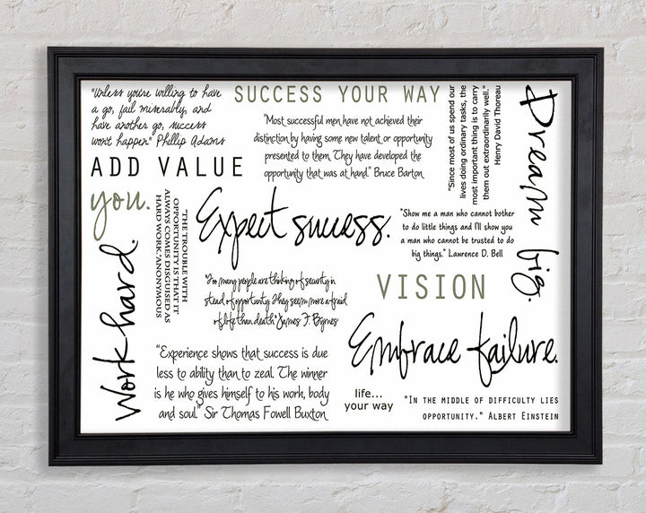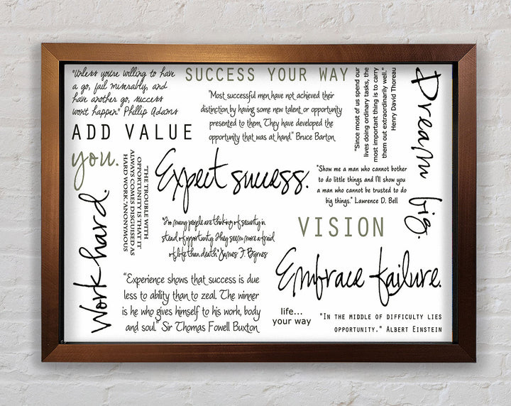 Introducing the "Work Hard Dream Big Expect Success" Framed Print, the perfect addition to any home or office space. This inspiring piece of framed art is available in six sizes, ranging from small to oversized, ensuring a perfect fit for any wall. Choose from a variety of colors to match your decor and make a bold statement. Each print is meticulously handmade in the United Kingdom, guaranteeing high-quality craftsmanship. Ready to hang, this art piece requires no additional effort, allowing you to enjoy its motivational message immediately. Elevate your environment with this beautiful and encouraging framed print, and let it remind you to always strive for success.
