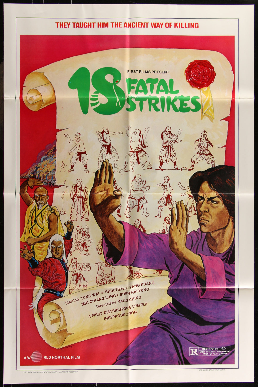 This product includes an 18 Fatal Strikes Original US One Sheet Movie Poster (27" x 41" [69 x 104 cm]), featuring Yeung Jing Chan in the 1981 action thriller. It shows minor wear on the edges and folds.