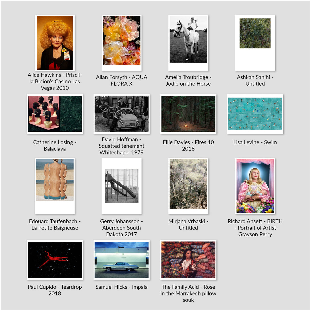 Alice Hawkins - Priscilla Binion's Casino Las Vegas 2010, Allan Forsyth - AQUA FLORA X, Amelia Troubridge - Jodie on the Horse, Ashkan Sahihi - Untitled, Catherine Losing - Balaclava, David Hoffman - Squatted tenement Whitechapel 1979, Edouard Taufenbach - La Petite Baigneuse, Ellie Davies - Fires 10 2018, Gerry Johansson - Aberdeen South Dakota 2017, Lisa Levine - Swim, Mirjana Vrbaski - Untitled, Paul Cupido - Teardrop 2018, Richard Ansett - BIRTH - Portrait of Artist Grayson Perry, Samuel Hicks - Impala, The Family Acid - Rose in the Marrakech pillow souk, Annegret Soltau - Mutter - Gluck mit Sohn, Felicity McCabe - B.Munkh Solongo, John Myers - Young girl 1973, Liza Ambrossio - Back to the Belly, Ronni Campana - Badly Repaired Cars, Simon Roberts - Ancient Woodland 1, Valda Bailey - Melancholy |