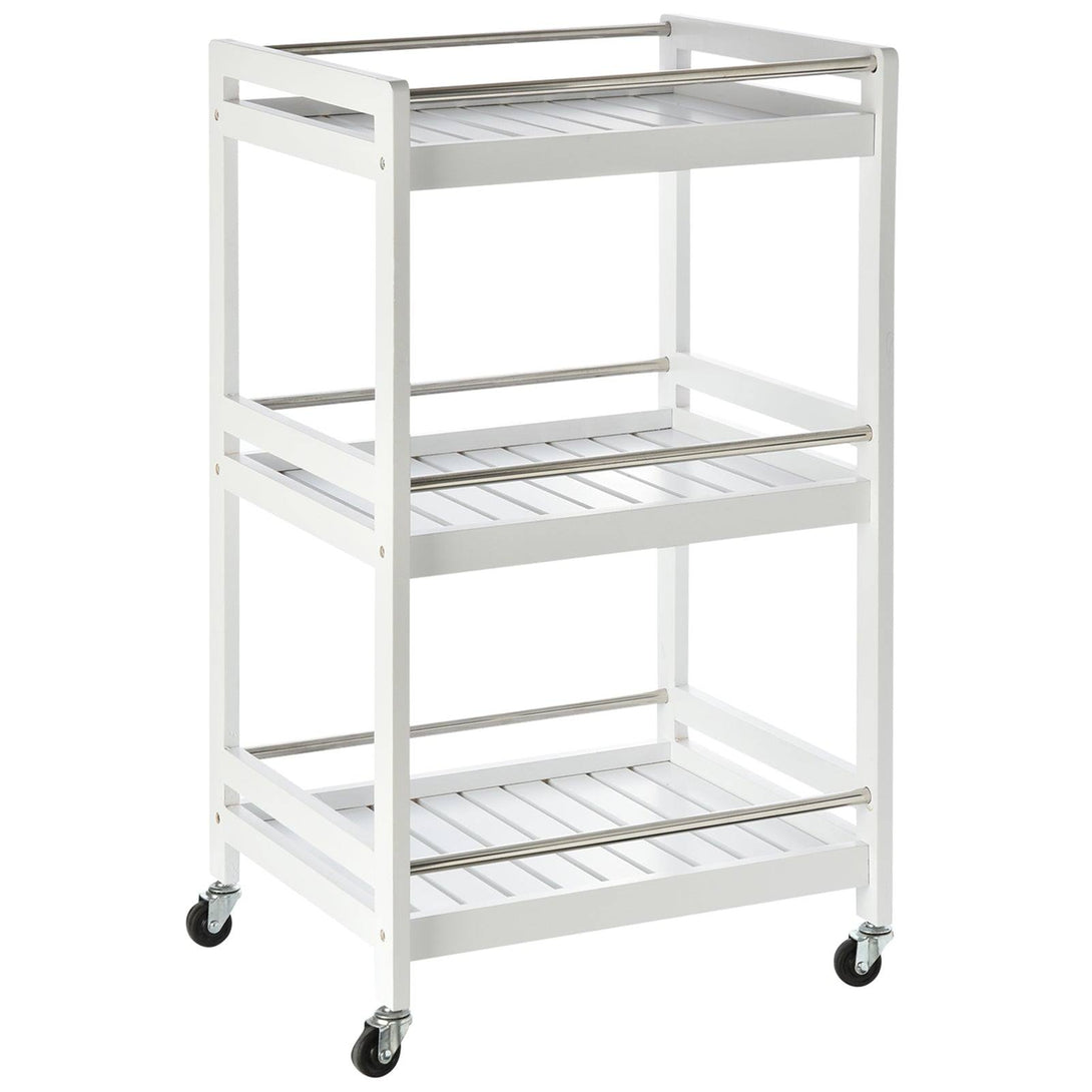This movable trolley from HOMCOM is the perfect piece for your kitchen, living room and beyond. Made from a blend of MDF and pine wood for a solid and durable structure, it is made into a three-tier design for plenty of storage room. Stainless steel bars and panels of wood prevent items falling off the trays, castor wheels ensure smooth movement whilst moving around.