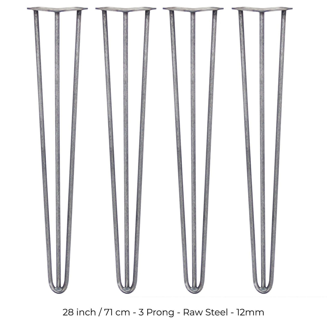 4 x 28" Hairpin Legs - 3 Prong - 12mm - Raw Steel
