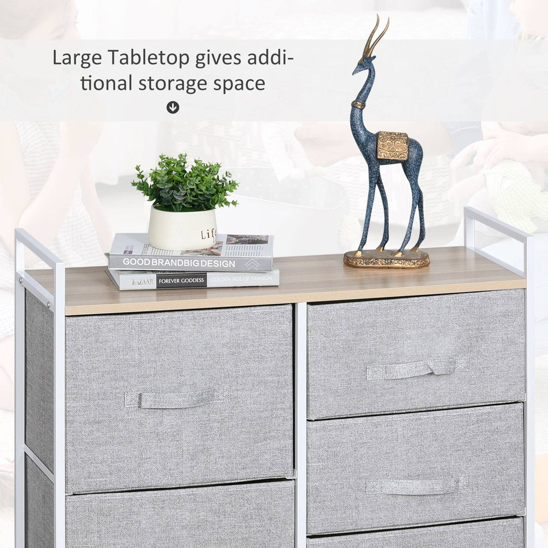 Bring easy and effortless storage into the home and beyond with this fabric drawer chest from HOMCOM. It features 2 small and three large drawers, giving you lots of room, with the flat surface top providing additional space. Made from linen, the drawers give a softened look to the appearance and feature handles to pull out easily. Connected to the metal frame with adjustable feet ensure this side cupboard keeps balanced, and it's finished with handles on the top so you can move it easily.