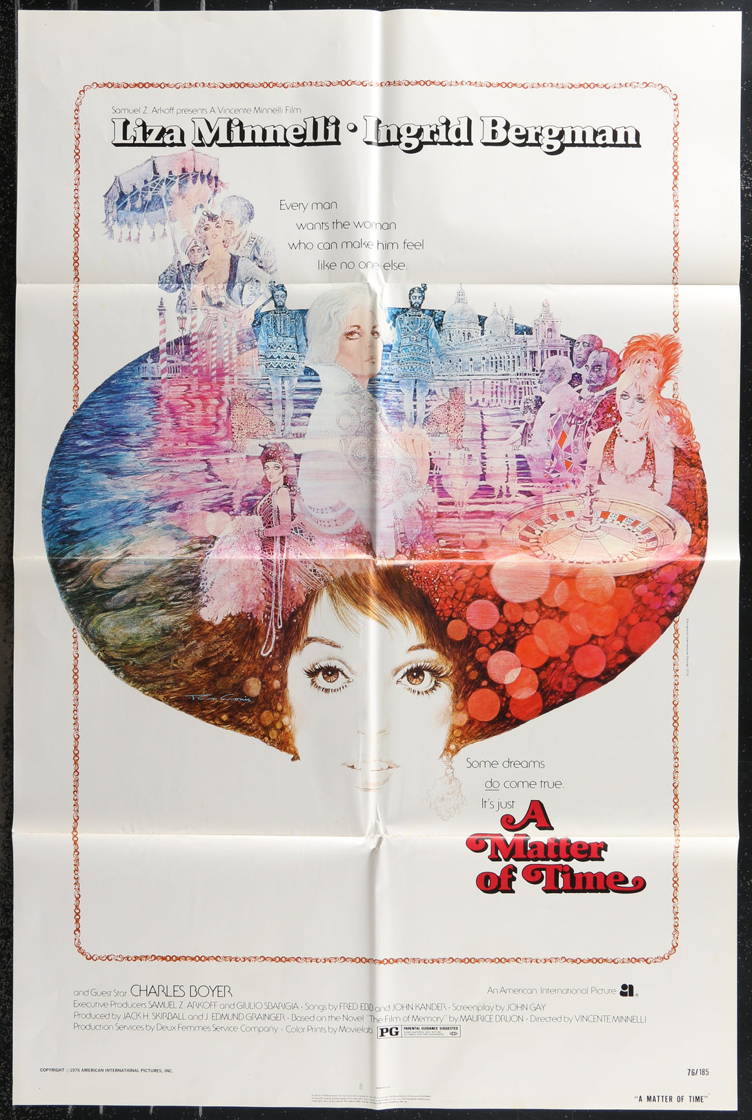 This is an Original US One Sheet Movie Poster (27" x 41" [69 x 104 cm]) for the 1976 romantic musical fantasy A Matter of Time, directed by Vincente Minnelli and starring Liza Minnelli and Ingrid Bergman. The artwork is created by Ted CoConis. Shows edge and fold wear with minor creasing. Some markings are also present.