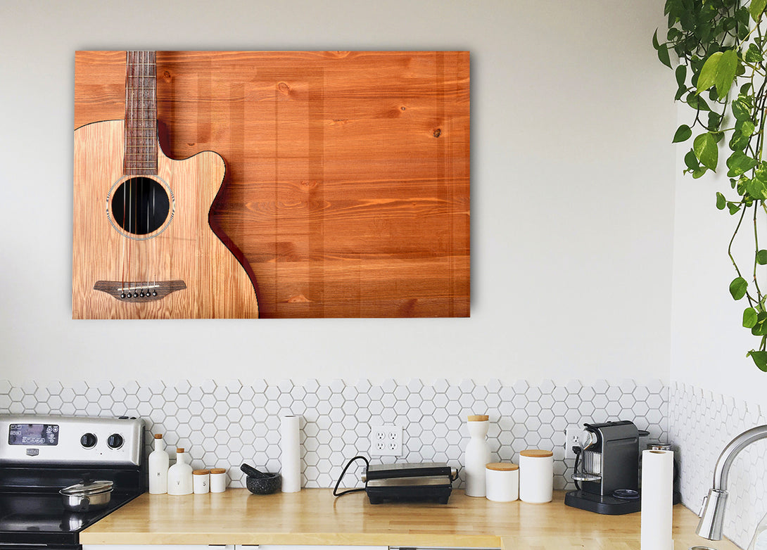 Acryldruck „Akustikgitarre“, UV-gedruckt auf 5 mm dickes Acrylglas. Wird mit allem geliefert, was Sie zum Aufhängen an die Wand brauchen.