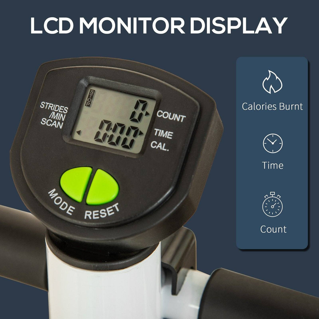 This HOMCOM stepper stand will help toning your calves, legs and surrounding areas of the body. A steel frame for a tough structure, it's fitted with two handlebars to hold on safely when working out. The large platforms with textured top help prevent feet slipping off. Comes complete with LCD screen - keeps track of total step count, time, and calories burnt.