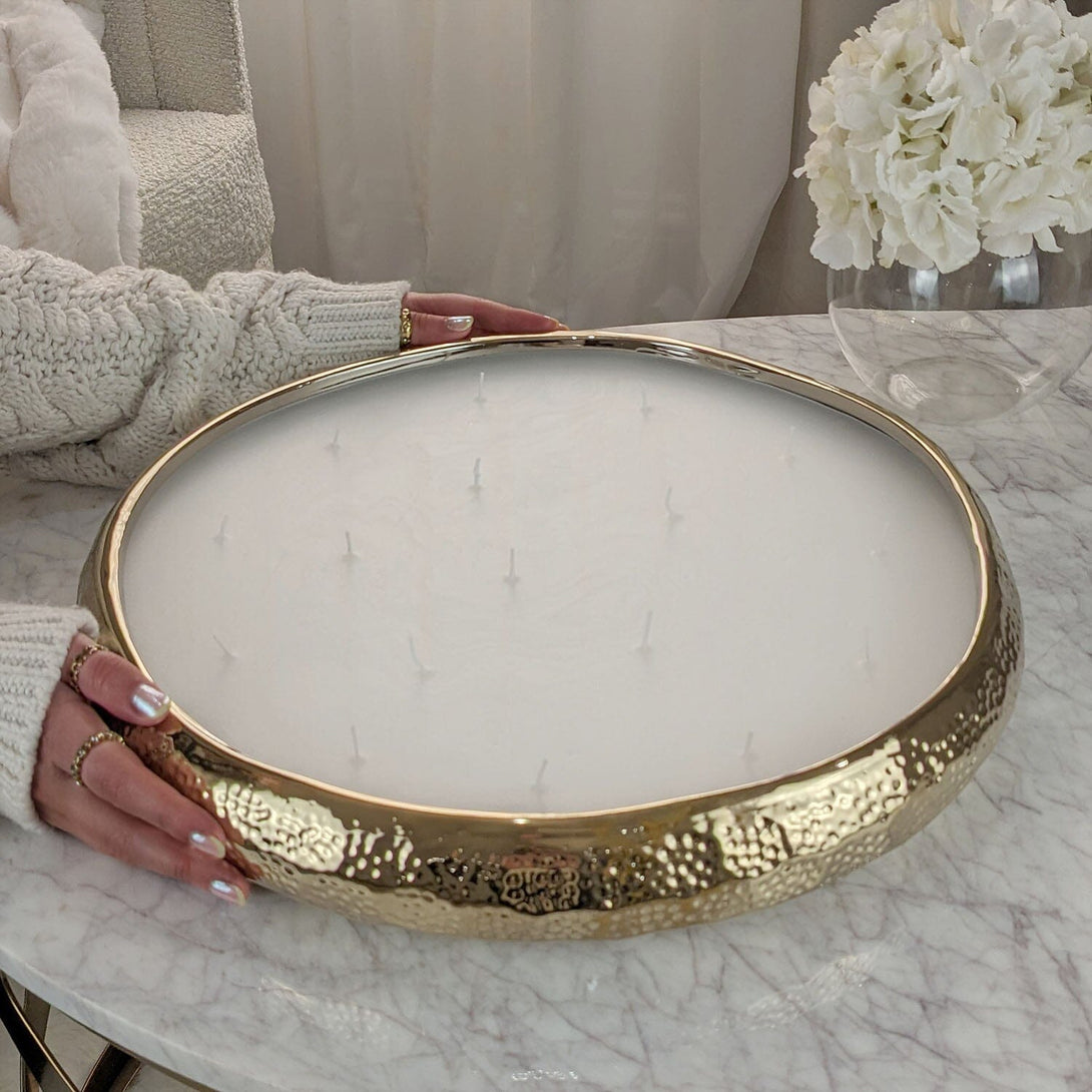 With its impressive size in a glam gold finish and 17 flickering wicks, this candle demands attention in any room.