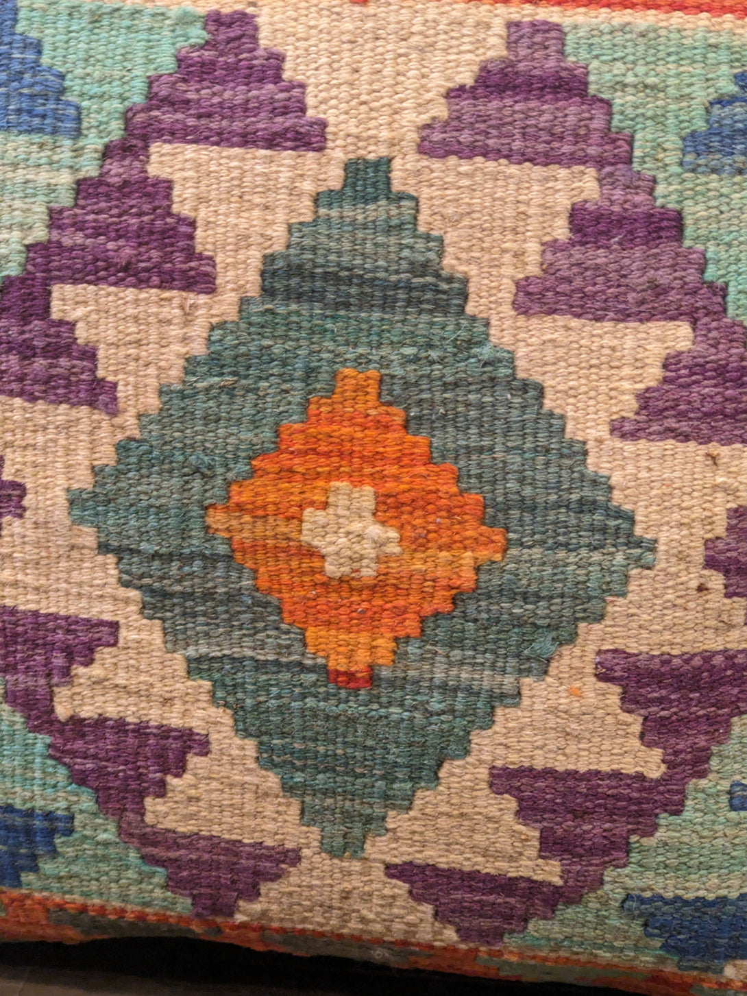 Each Afghanistan Kilim Cushion Cover is a one of a kind creation made from vintage tribal kilims. Bold geometric patterns and earthy tones bring a touch of tradition and timeless charm to any setting. Crafted from pure wool with a sturdy cotton backing, they blend rustic texture with rich cultural history. Perfect for adding warmth character and story to your home.