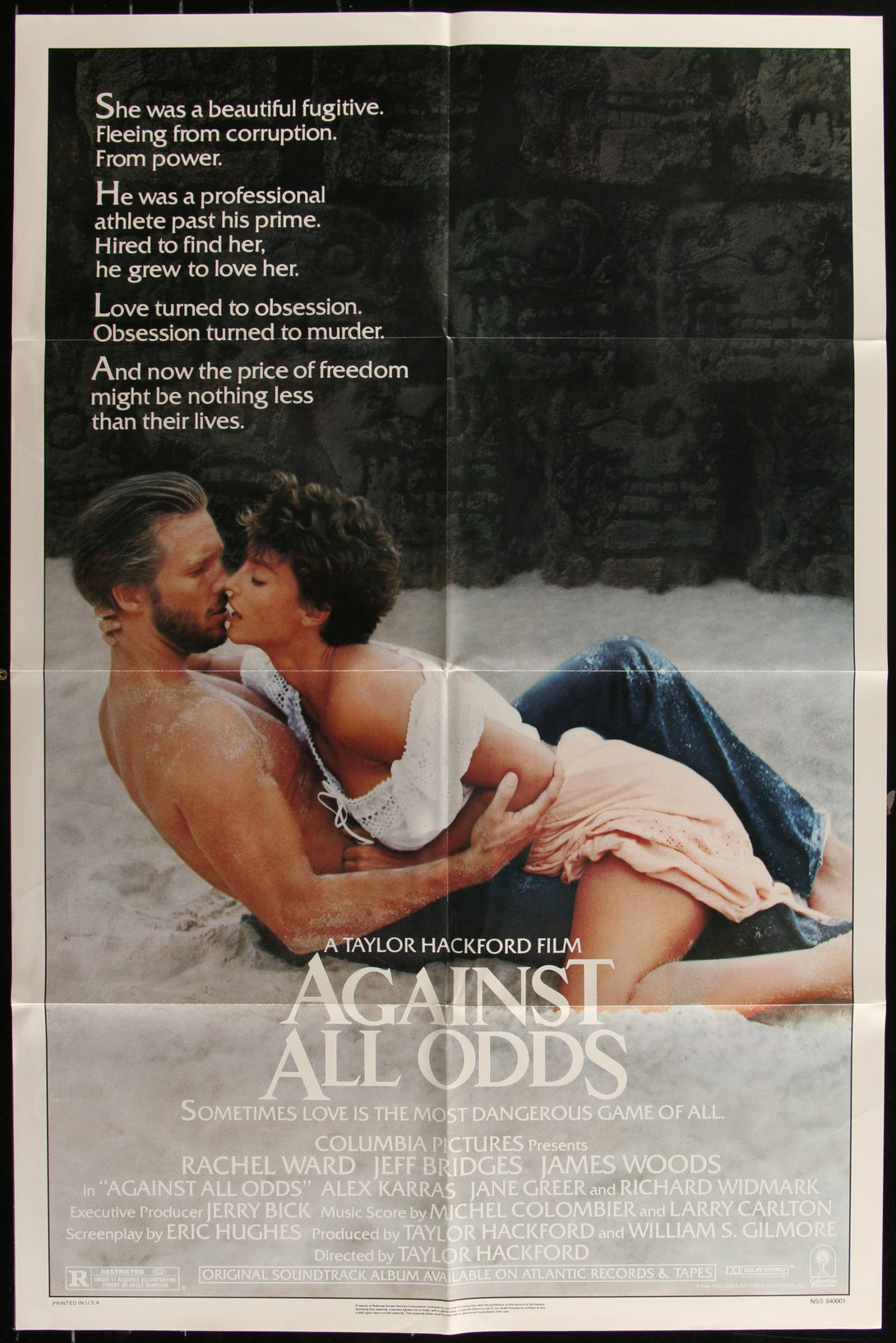 This Original Folded One-Sheet Movie Poster from 1984's Against All Odds measures 27" x 41" (69 x 104 cm), and features Rachel Ward, Jeff Bridges, James Woods, Alex Karras, Jane Greer, and Richard Widmark. Minor wear present along edges and folds; please refer to accompanying photo. Edge and fold wear with some creasing nd markings.