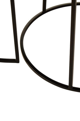 The 2 colour Akola set of 2 tables feature round tops with a metallic antique brass colour and nickel colour. Crafted by hand, a pane of antiqued glass is set into the middle of a textured metal frame table . Their legs have a minimal design and are made from black steel.