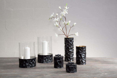 Robust black finish steel is hammered to create a multifaceted design of this trinket box. It has a matching lid complemented with a decorative handle. A minimal outline along the indented trim harmonises with the warm metallic inner of the box.
