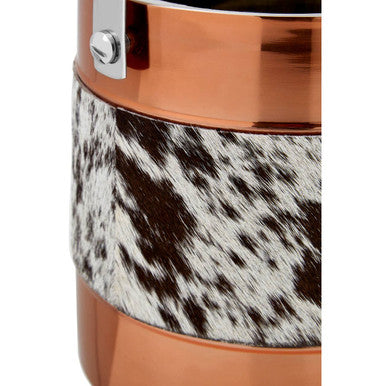 The Albany stylish ice bucket is made from tough stainless steel and has a reflective copper finish adorned with tactile cowhide in the middle. Its lid and carry handle are coloured silver to contrast.