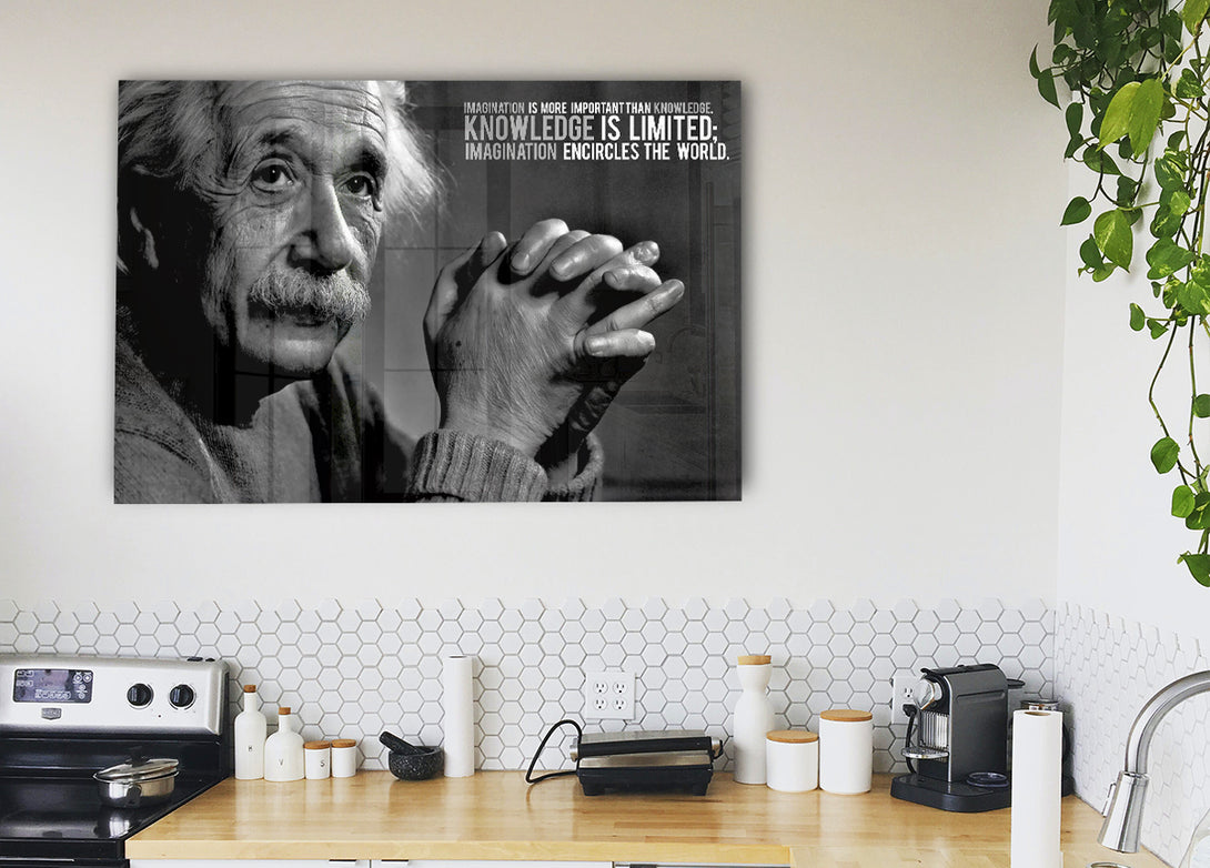 Albert Einsteins „Imagination Is More Important“-Acryldruck, UV-gedruckt auf 5 mm dickes Acrylglas. Wird mit allem geliefert, was Sie zum Aufhängen an die Wand benötigen.