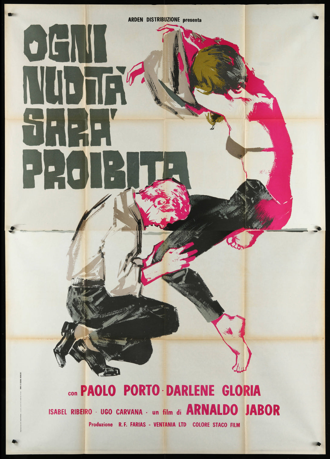 This poster is an original 1974 folded Italian two-panel for the film All Nudity Shall Be Punished. It measures 55" x 78" (140 x 198 cm) and features the stars Paulo Porto, Darlene Gloria, and Elza Gomes in the Arnaldo Jabor romantic drama about a prostitute. Please note that this poster is designed to overlap in 2 sections, with some wear and separation at the fold meet points and discolouration along the fold lines.