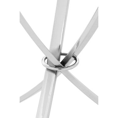Each bow-shaped leg is made from sleek metal, with a reflective chrome finish that gives the side table a contemporary Boutique look. A matching metal hoop adds a decorative touch at the cross section. The legs flow into the round chrome mirror tabletop.
