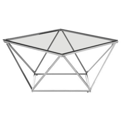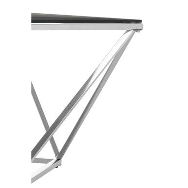Its distinctive frame is made from stainless steel and boasts a silver finish that complements reflective metallic accessories and textiles. The top is tempered glass. Style it with luxe furniture.