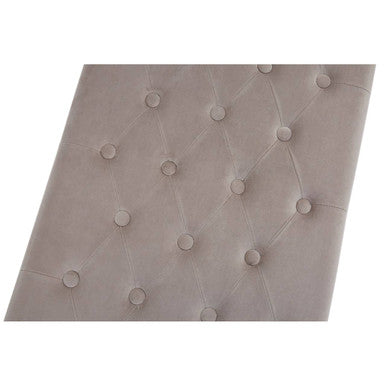 The plump cushion is dressed in soft velvet, with a button tufted finish that creates a quilted finish. The base is made from smooth stainless steel and boasts a reflective silver finish that complements the upholstery. Angled lines dart across the base,