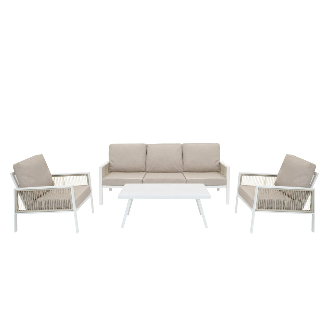 The 4-piece aluminium sofa set delivers a timeless blend of comfort and contemporary elegance. Featuring a generously sized three-seater sofa, two deep-cushioned armchairs, and a coordinating coffee table, it offers ample space for hosting friends or enjoying peaceful moments outdoors. The striking white finish adds a modern look, while the clean lines and neutral tones ensure seamless integration with any garden or patio aesthetic. Whether it's your morning coffee spot or the hub of a summer gathering, this set creates a sophisticated and inviting atmosphere.