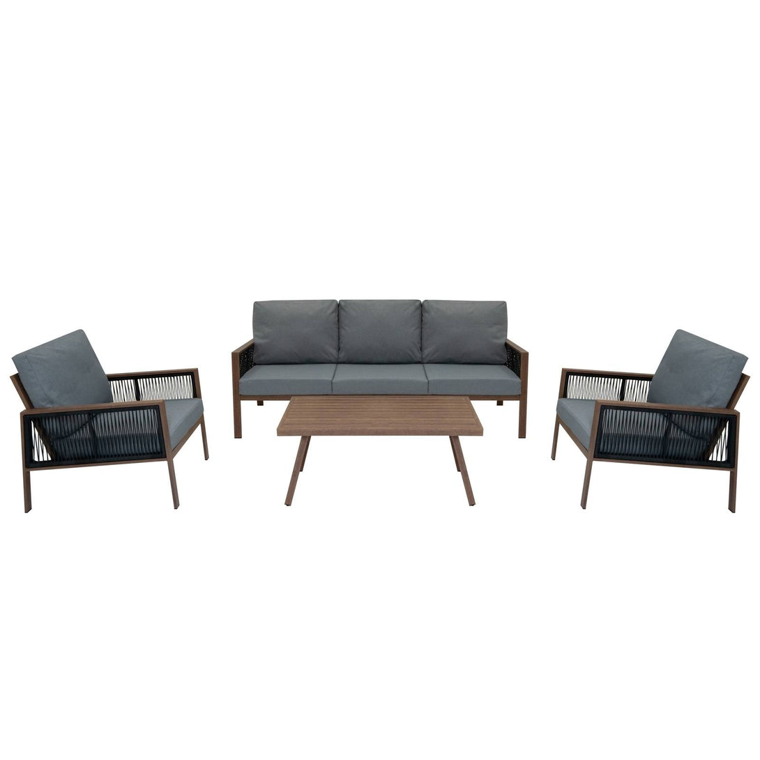 The 4-piece aluminium sofa set delivers a timeless blend of comfort and contemporary elegance. Featuring a generously sized three-seater sofa, two deep-cushioned armchairs, and a coordinating coffee table, it offers ample space for hosting friends or enjoying peaceful moments outdoors. The striking wood-effect finish adds a warm, natural look, while the modern lines and neutral tones ensure seamless integration with any garden or patio aesthetic. Whether it's your morning coffee spot or the hub of a summer gathering, this set creates a sophisticated and inviting atmosphere.