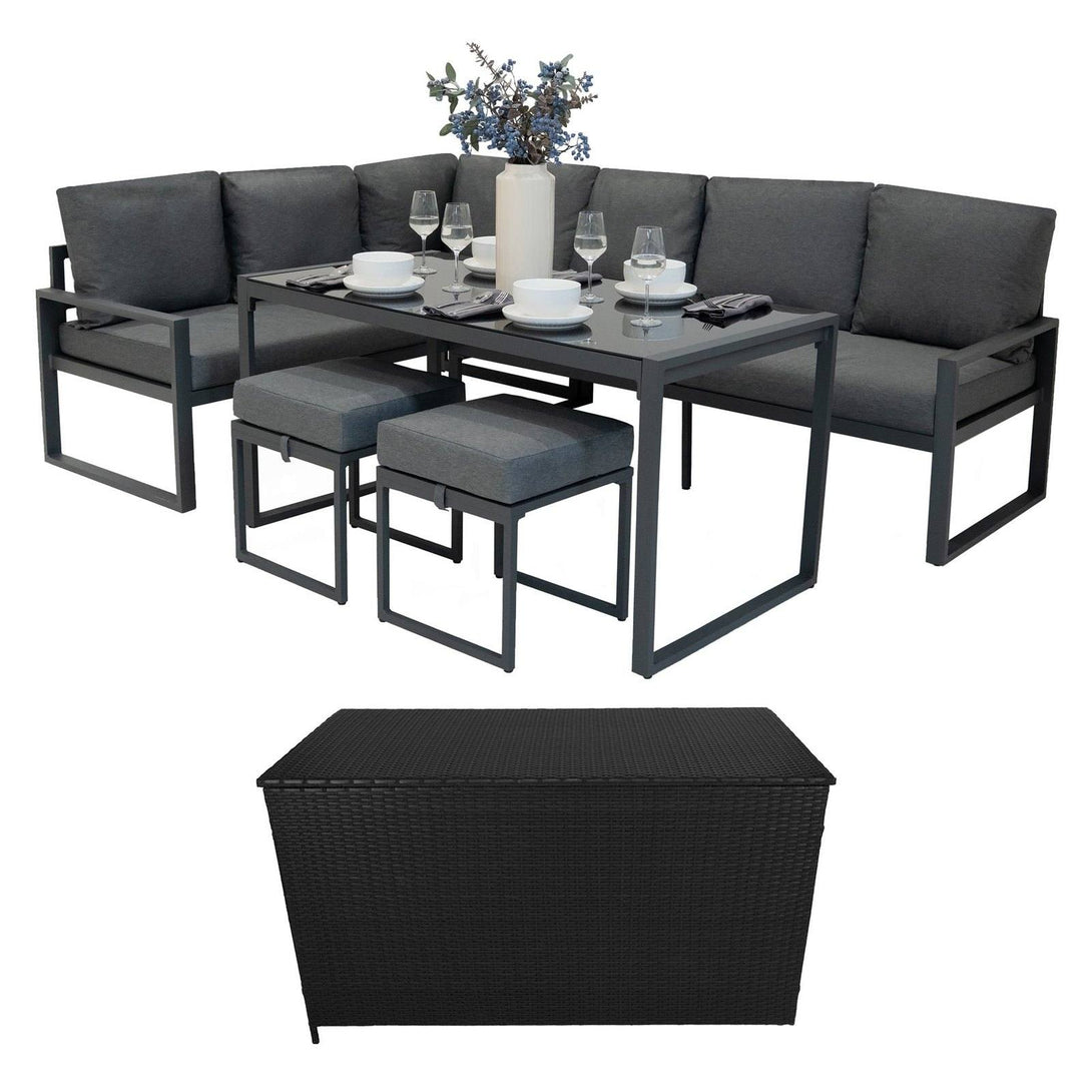 Create the ultimate outdoor sanctuary with this stylish garden bundle, pairing a contemporary aluminium corner sofa set with a spacious black rattan storage box.