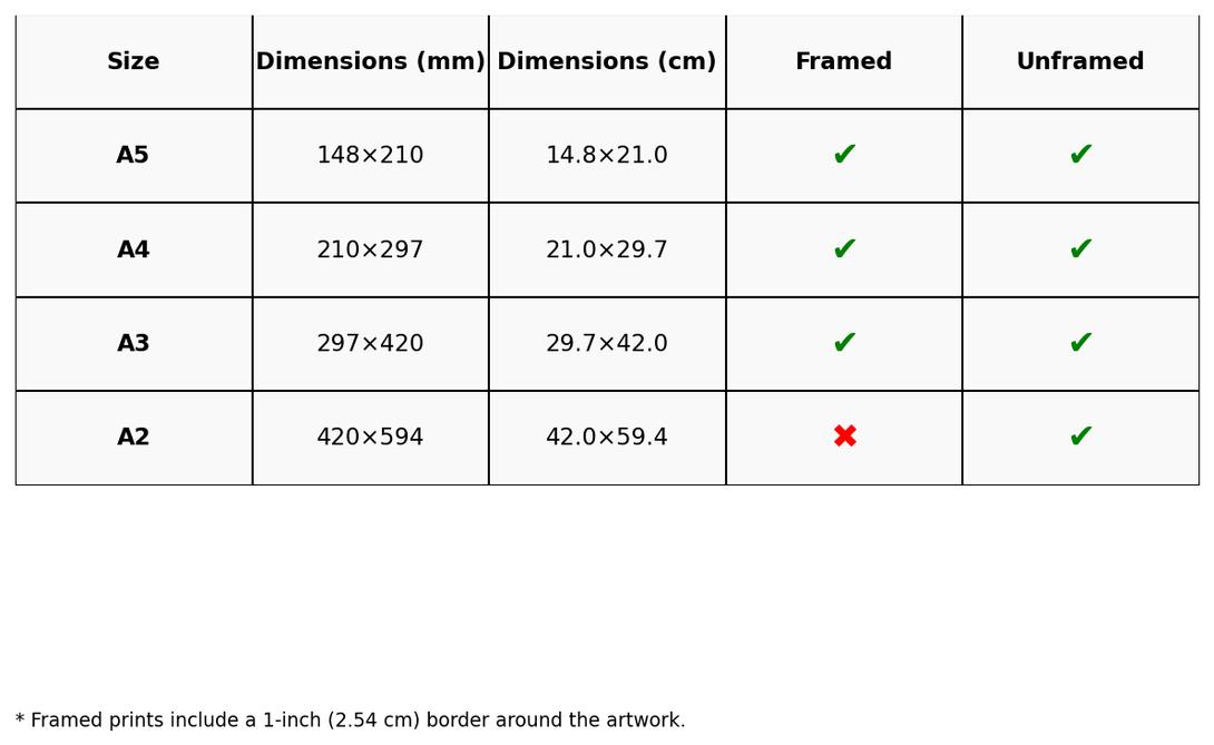 A5 (unframed) 5.8 × 8.3 in, A4 (unframed) 8.3 × 11.7 in, A3 (unframed) 11.7 × 16.5 in, A2 (unframed) 16.5 × 23.4 in, A5 Framed, A4 Framed, A3 Framed |