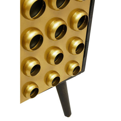 Boasting protruding metal circles in the warm metallic finish, this sideboard is a nod to the golden era of mid-century. Offering storage with two doors and a shelf, the black mango wood frame sits atop oblique legs and combines style with functionality.