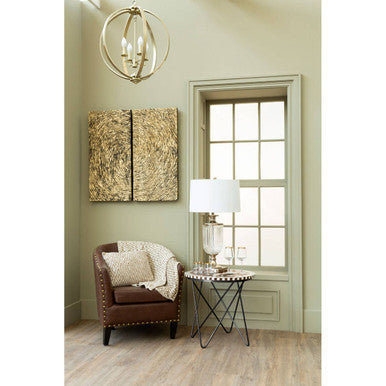 This side table has a round top surface made from acacia wood. Its dark hues and distinctive grain complement the black legs, with white trim that gives it a contemporary geometric look. The iron legs form a distinctive lattice and feature a weathered finish that lends further texture to this luxury piece.