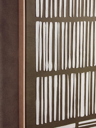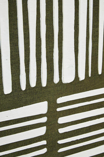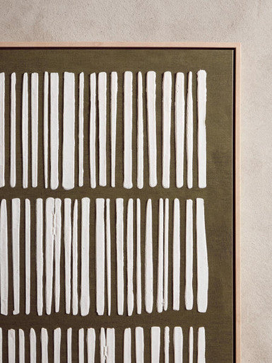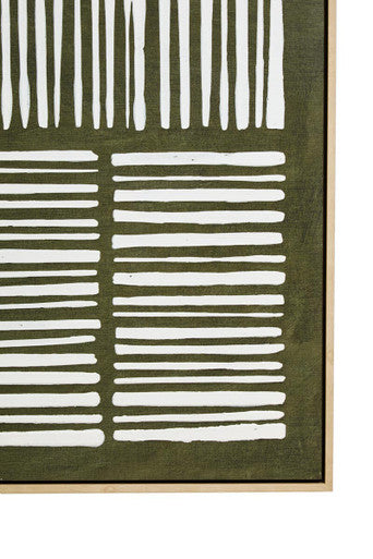This canvas wall art is an artistic impression featuring a series of linear abstract patterns in natural and green hues. It serves as a striking statement piece and is a versatile addition to modern interiors.