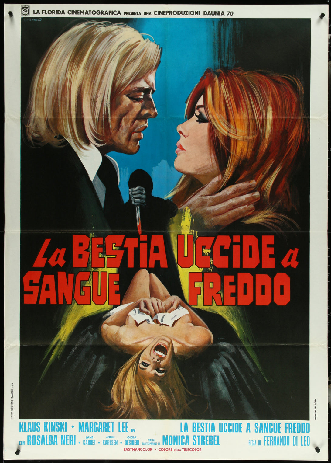 This Folded Italian One-Panel Movie Poster for Asylum Erotica, measuring 39" x 55" (99 x 140 cm), is an authentic piece of memorabilia for the 1971 Italian horror sexploitation movie directed by Fernando Di Leo. Featuring Klaus Kinski, Margaret Lee, and Monica Strebel, this poster shows some edge and fold wear.