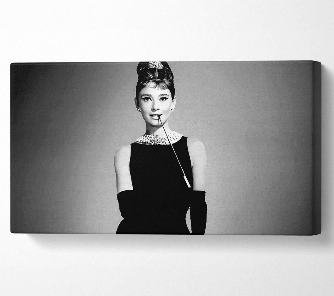 Audrey Hepburn – Zigarette – Frühstück bei Tiffany – Leinwand, gedruckt auf beschichteter Polyester-Leinwand. Auf einem 44 mm großen Kastenrahmen montiert, fertig zum Aufhängen.