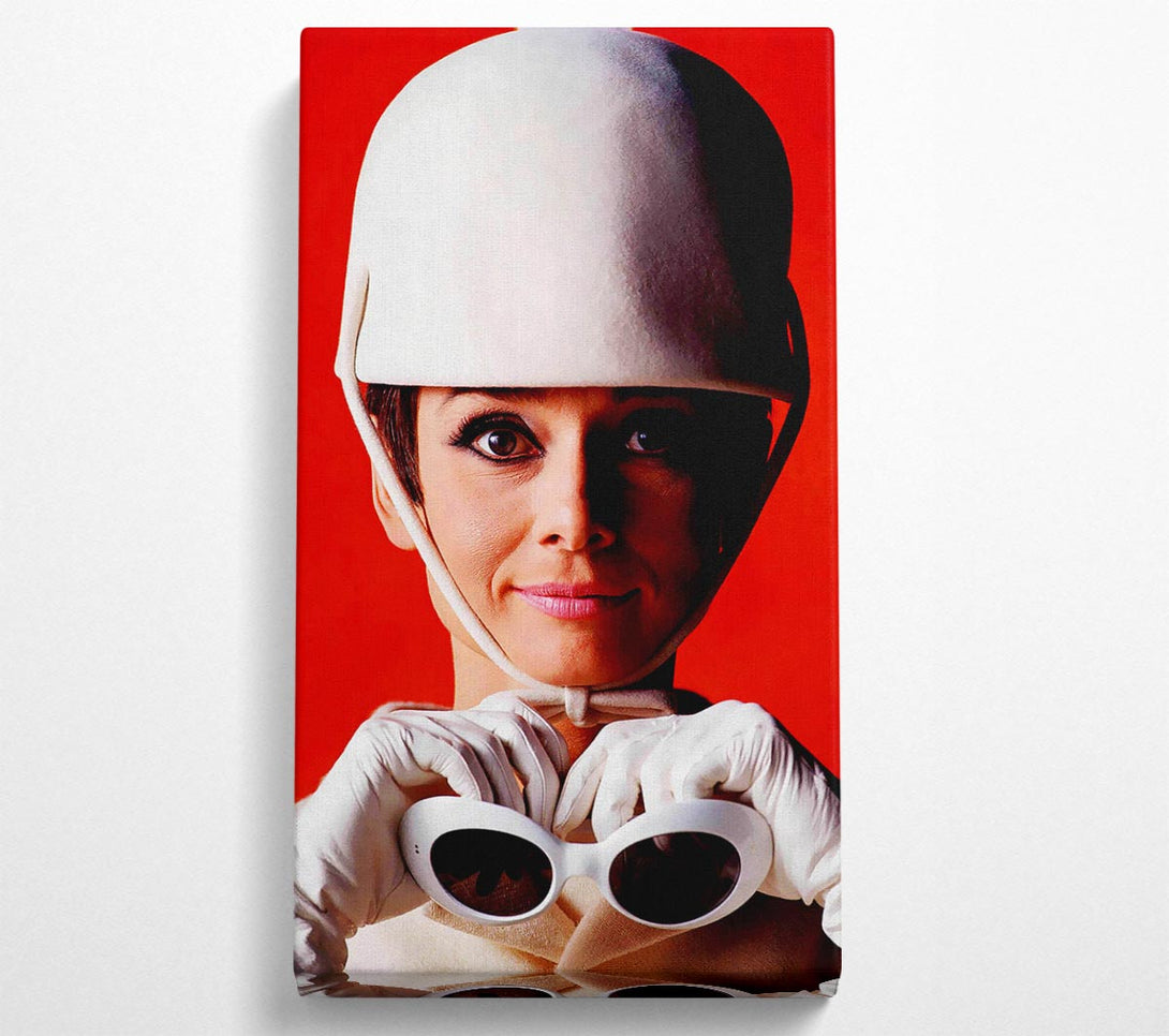 Leinwandbild „Audrey Hepburn Goggles“, gedruckt auf beschichtetem Polyester-Canvas. Auf einem 44 mm großen Kastenrahmen montiert, fertig zum Aufhängen.