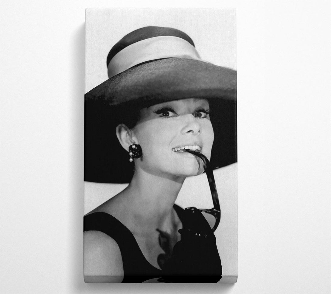 Audrey Hepburn-Hut-Leinwand, gedruckt auf beschichteter Polyester-Leinwand. Auf einem 44 mm großen Kastenrahmen montiert, fertig zum Aufhängen.