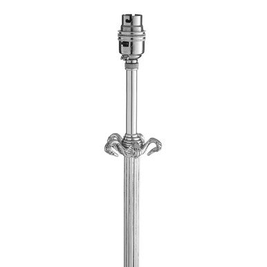 The August table lamp base features a number of classical design motifs, including ornate carvings and a fluted column. This luxurious Boutique piece is made from brass, and has an antique silver plating that gives it its reflective look.
