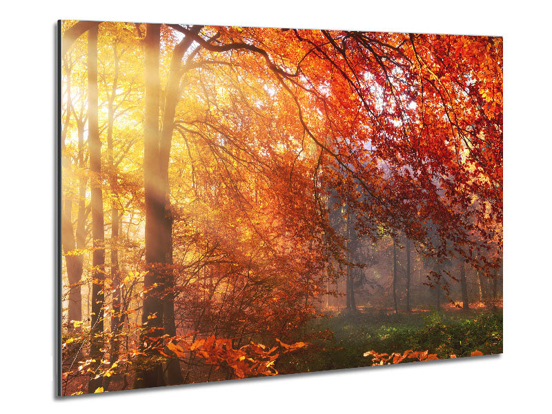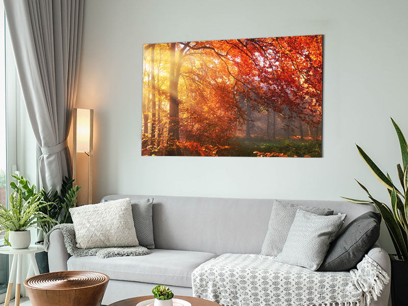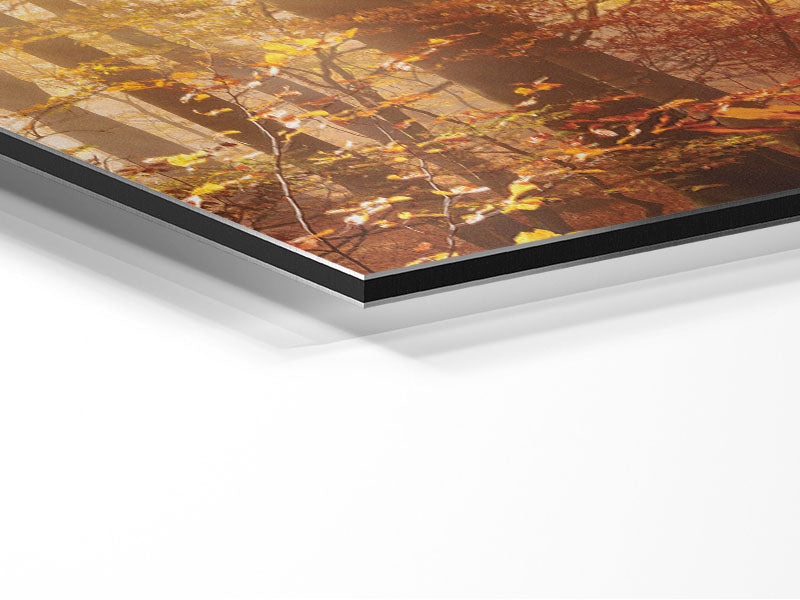 Sonnenstrahlen im Herbstwald. Gedruckt auf gebürstetem Aluminium-Dibond. Eine moderne Art, Kunst zu präsentieren und leicht zu pflegen.