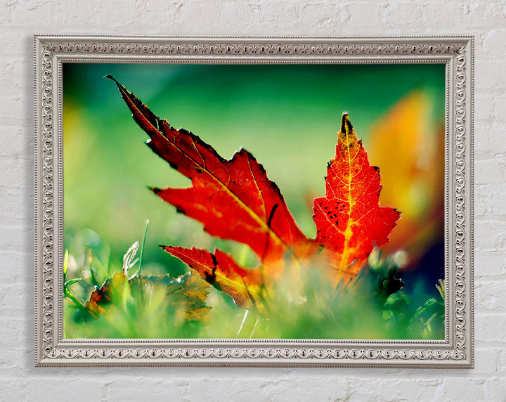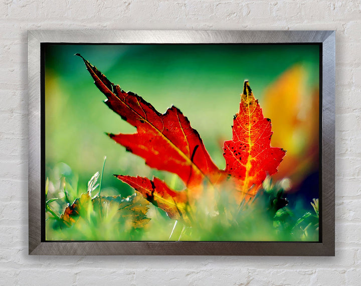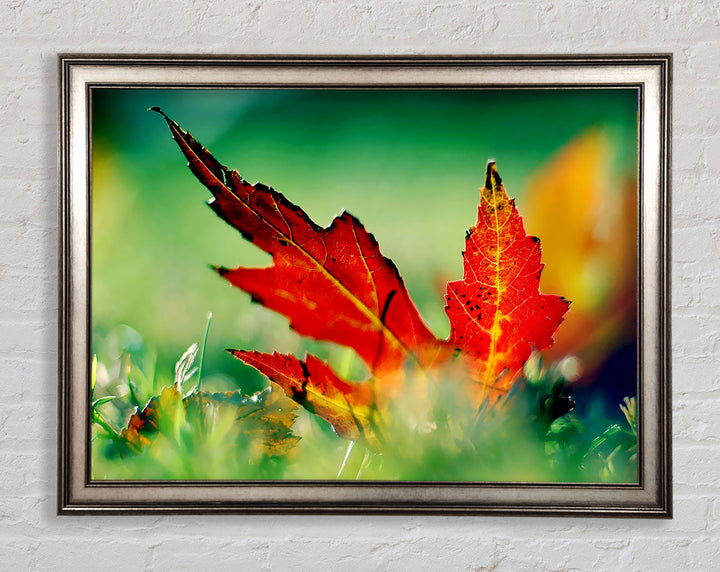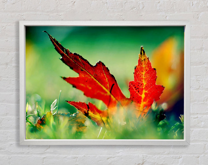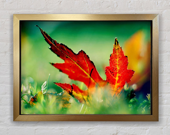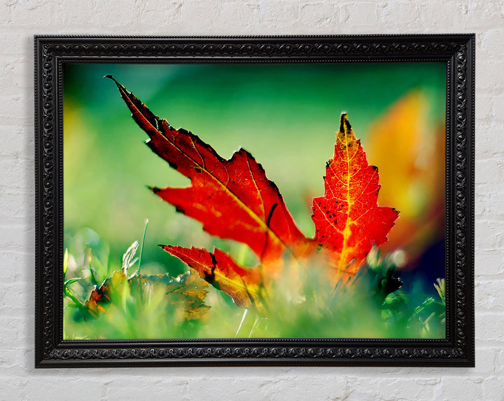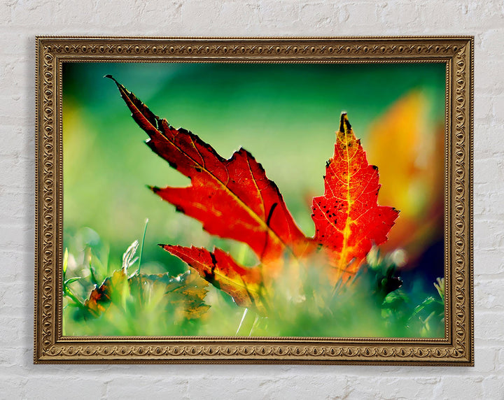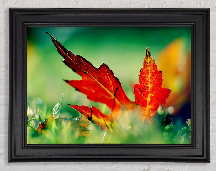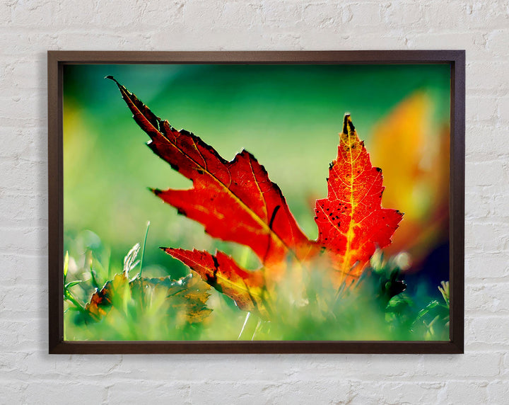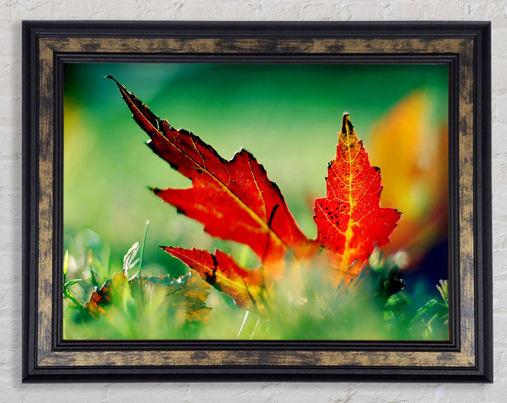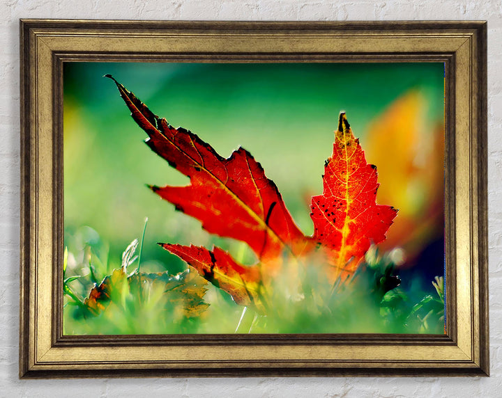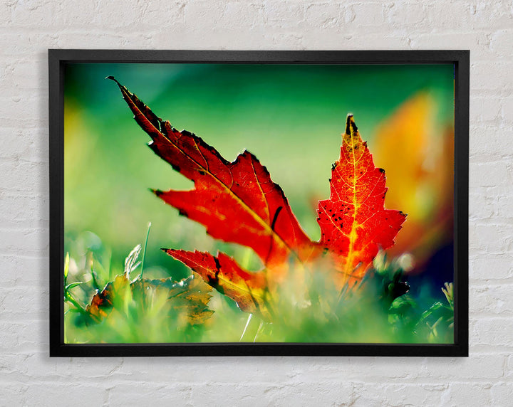 Gerahmter Druck „Herbstrotes Blatt auf dem Boden“, erhältlich in mehreren Rahmenfarben. Fertig zum Aufhängen aus der Schachtel und handgefertigt im Vereinigten Königreich.