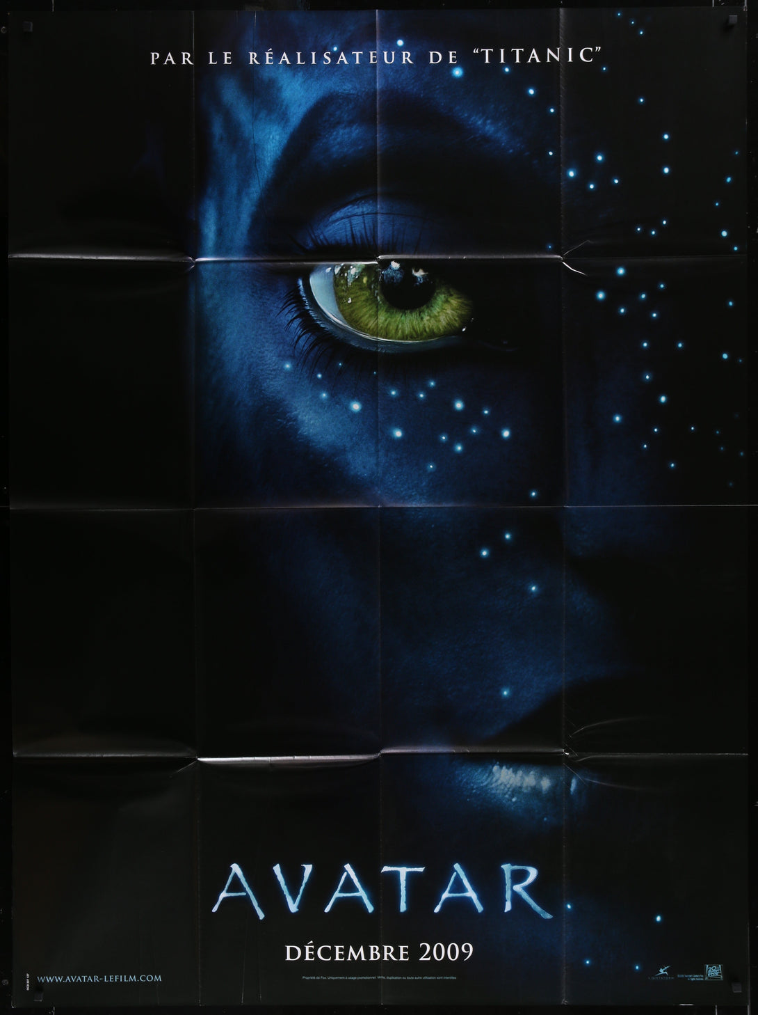This Avatar (2009) poster is an original French one-panel "Grande," measuring 47" x 63" (119 x 160 cm). It features Sam Worthington, Zoe Saldana, and Sigourney Weaver in the James Cameron science fiction epic. The poster shows signs of edge and fold wear. Some creasing.