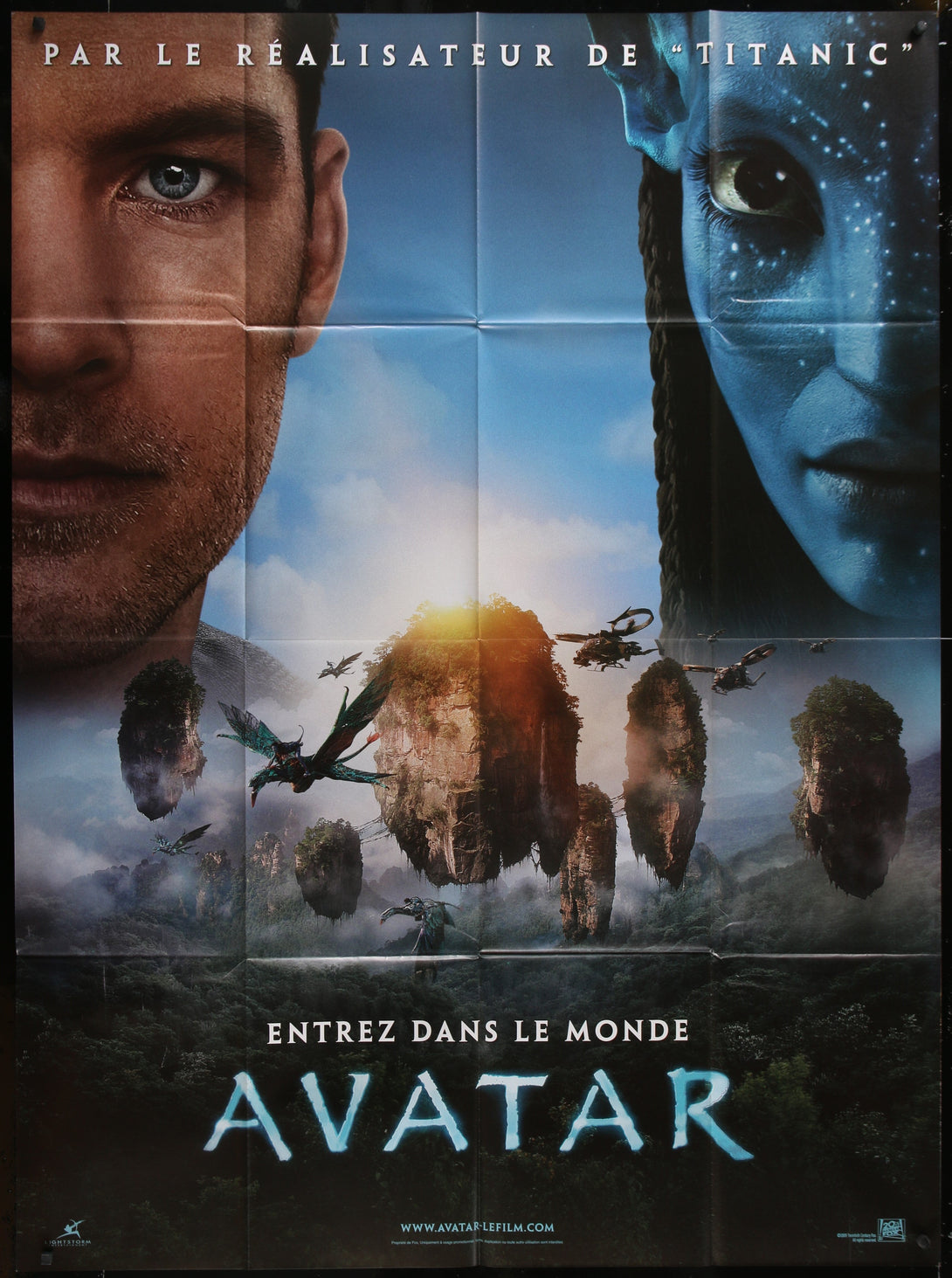 This original folded French one-panel "Grande" movie poster measures 47" x 63" (119 x 160 cm) and is for Avatar, the 2009 science fiction epic directed by James Cameron, featuring Sam Worthington, Zoe Saldana, and Sigourney Weaver. The poster shows signs of edge and fold wear.