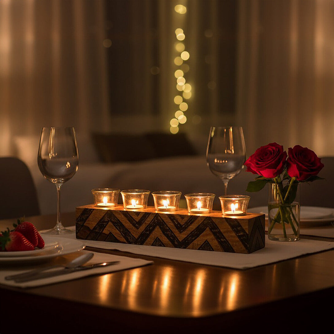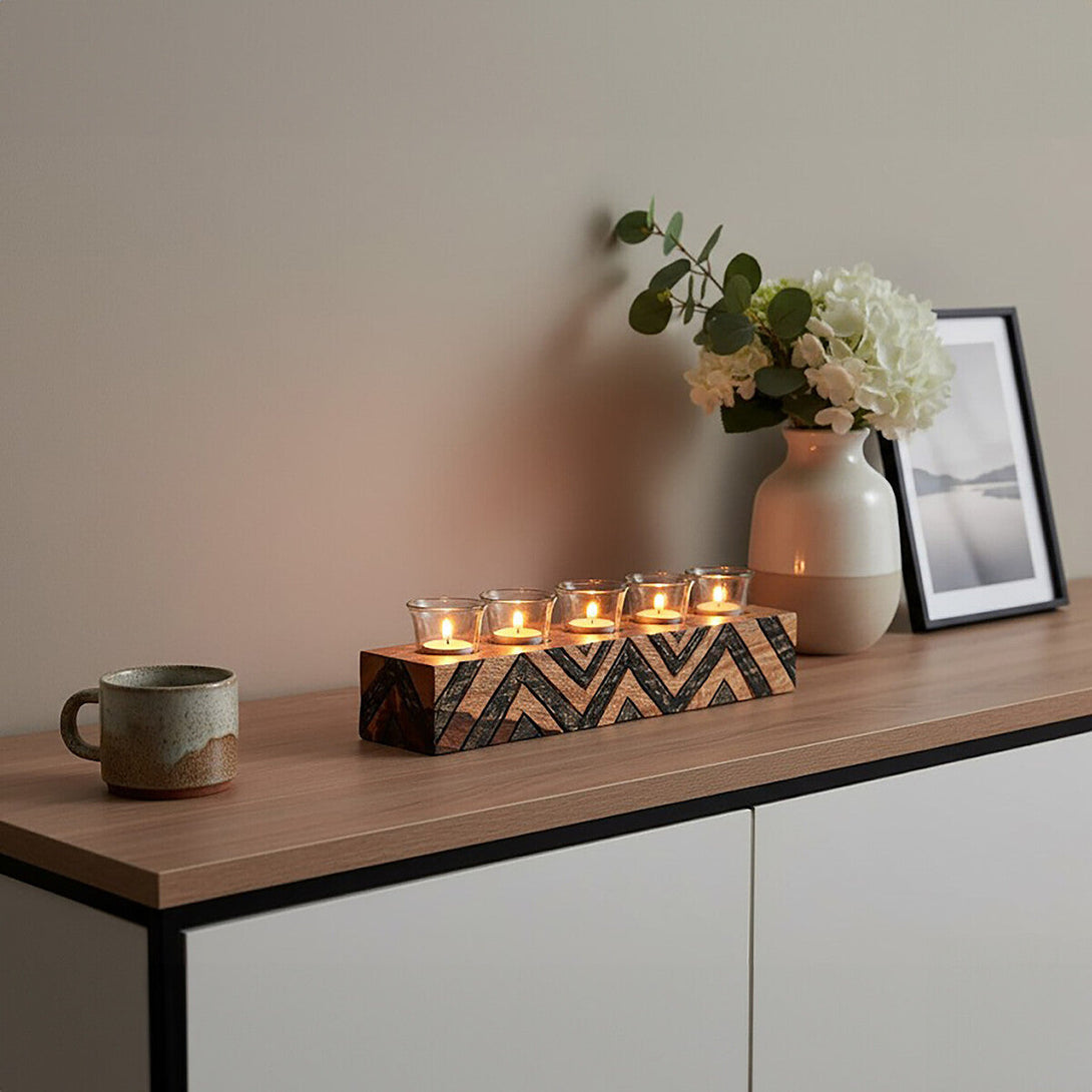 Crafted from mango wood, this rectangular tealight holder will make an attractive feature with its bold grain variations and texture. The surface has a zigzag pattern on it which is coloured black to give it a tribal look. Five indented holes on the top of the holder contain glass inserts for tealights.